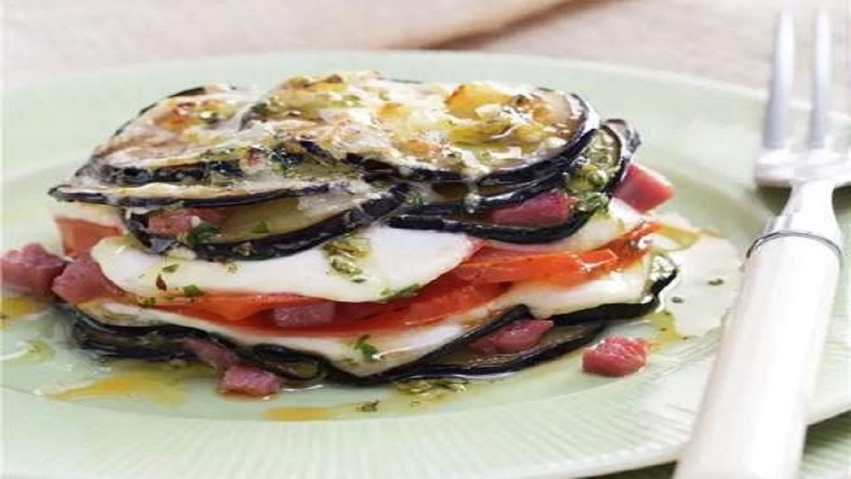 • Para montar las milhojas alterna capas de berenjena con otras de tomate y mozzarella, introduciendo el jamón en tacos. Aliña con el aceite aromatizado con las hierbas.