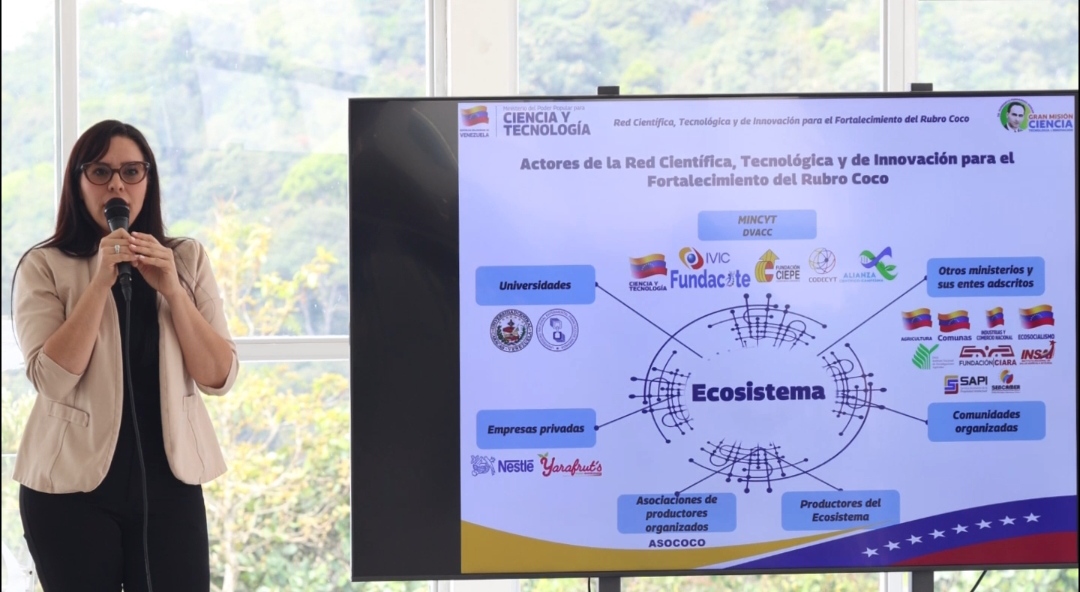 La ministra de Ciencia y Tecnología, Gabriela Jiménez, anunció la instalación de la I Mesa Técnica de la Red Científica, Tecnológica y de Innovación para el fortalecimiento rubro coco, como parte de la agenda que impulsa la soberanía agroalimentaria en el país.