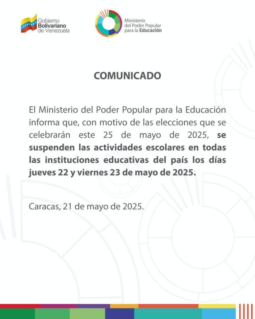 La información fue anunciada por un comunicado publicado por el ente educativo a través de sus redes sociales. “El Ministerio del Poder Popular para la Educación informa que, con motivo de las elecciones que se celebrarán este 25 de mayo de 2025, se suspenden las actividades escolares en todas las instituciones educativas del país los días jueves 22 y viernes 23 de mayo de 2025”, reza el comunicado.