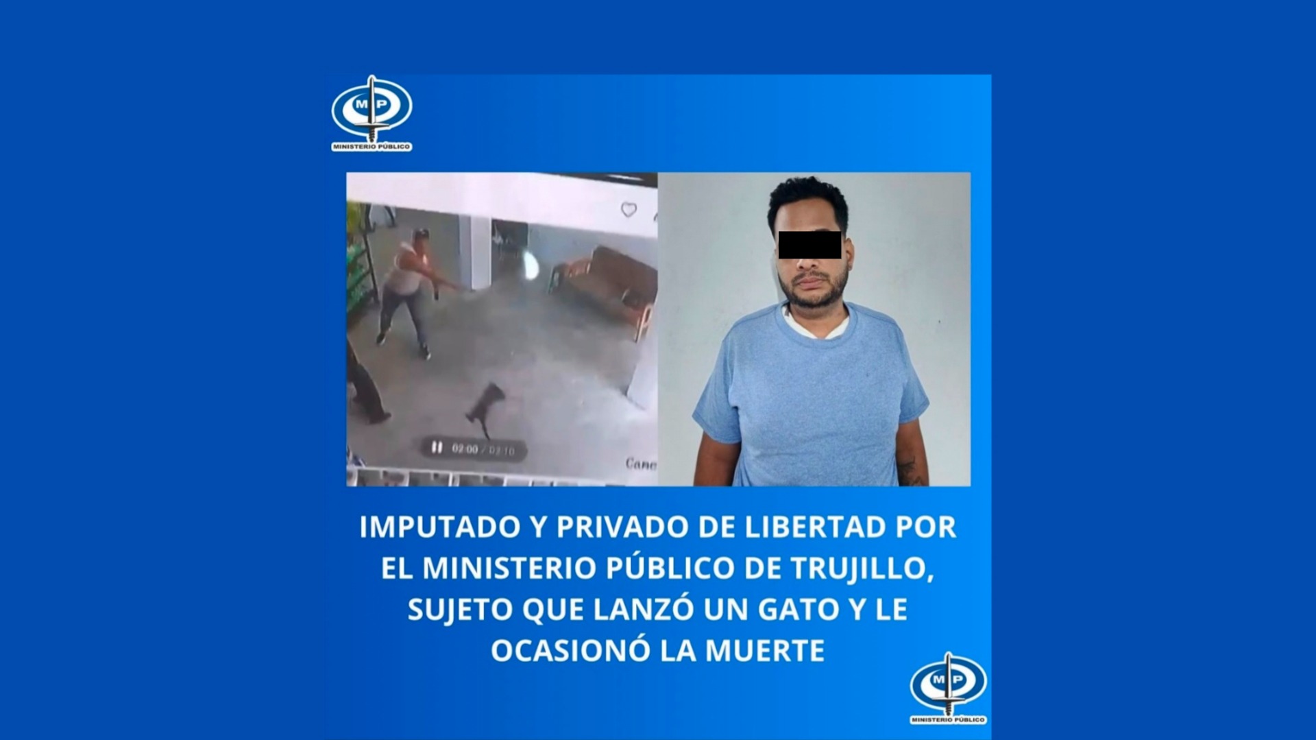 El Ministerio Público informó que un ciudadano identificado como Carlos Sequera fue imputado y privado de libertad en el estado Trujillo, luego de causar la můerte de un felino al lanzarlo al suelo. El caso fue procesado de inmediato por las autoridades competentes.