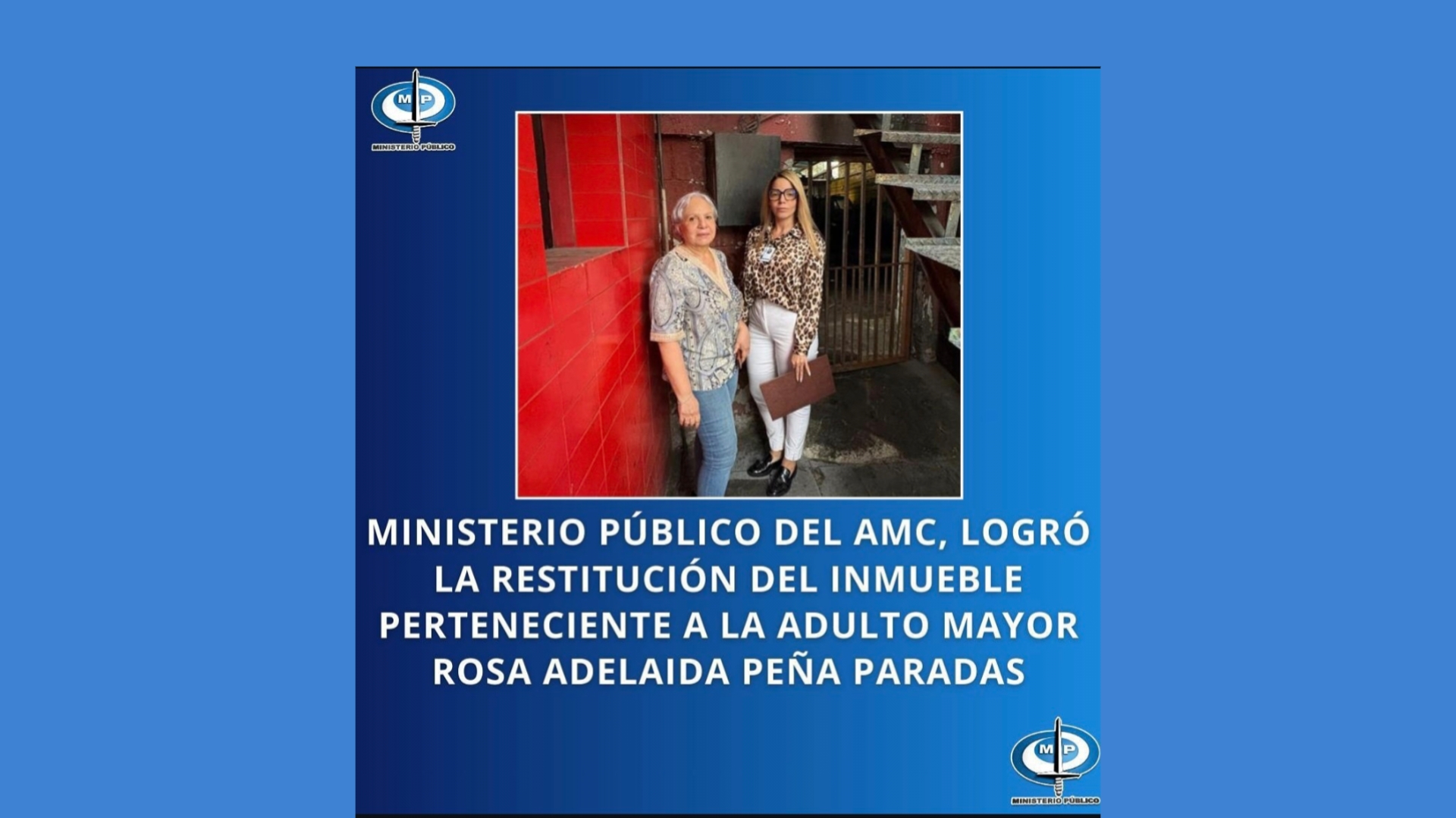 El Ministerio Público del Área Metropolitana de Caracas (AMC) informó que, en respuesta a la solicitud de la ciudadana Rosa Adelaida Peña Paradas, se logró la restitución de su propiedad ubicada en la Calle Uruguay, entre la Avenida San Martín y calle 9, en la Parroquia San Juan, Distrito Capital.