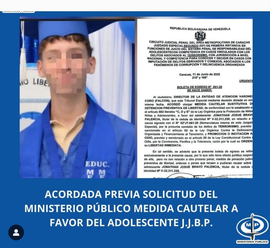El Ministerio Público (MP) informó el miércoles 11 de junio que fue acordada una medida cautelar a favor de J.J.B.P, un adolescente de 17 años de edad diagnosticado con Trastorno por Déficit de Atención e Hiperactividad (TDAH), quien se encontraba privado de libertad en Coro, estado Falcón.