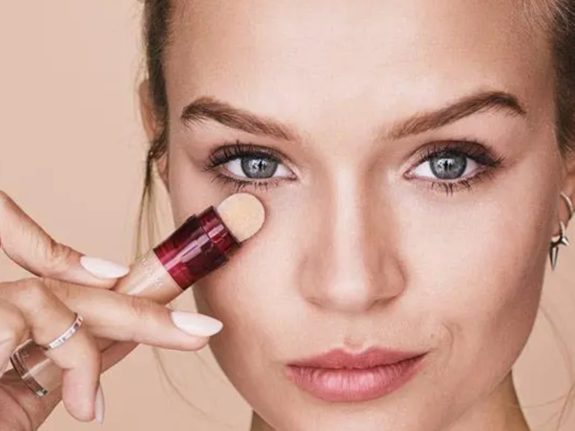 Primer truco, combinar dos tonos de corrector, primero, aplica uno con subtono melocotón o un pre-corrector para neutralizar el color morado y, después, uno apenas medio tono más claro que tu piel para iluminar. Difumina a toques con una esponja húmeda hasta integrarlo completamente. Este contraste corrige sin sobrecargar y deja un acabado fresco, uniforme y de aspecto descansado. En lugar de extender el corrector en toda la ojera, traza una pequeña línea ascendente desde debajo. El resultado es una mirada más abierta y juvenil, ideal para los días en los que la falta de sueño quiere hacerse notar más de la cuenta.
