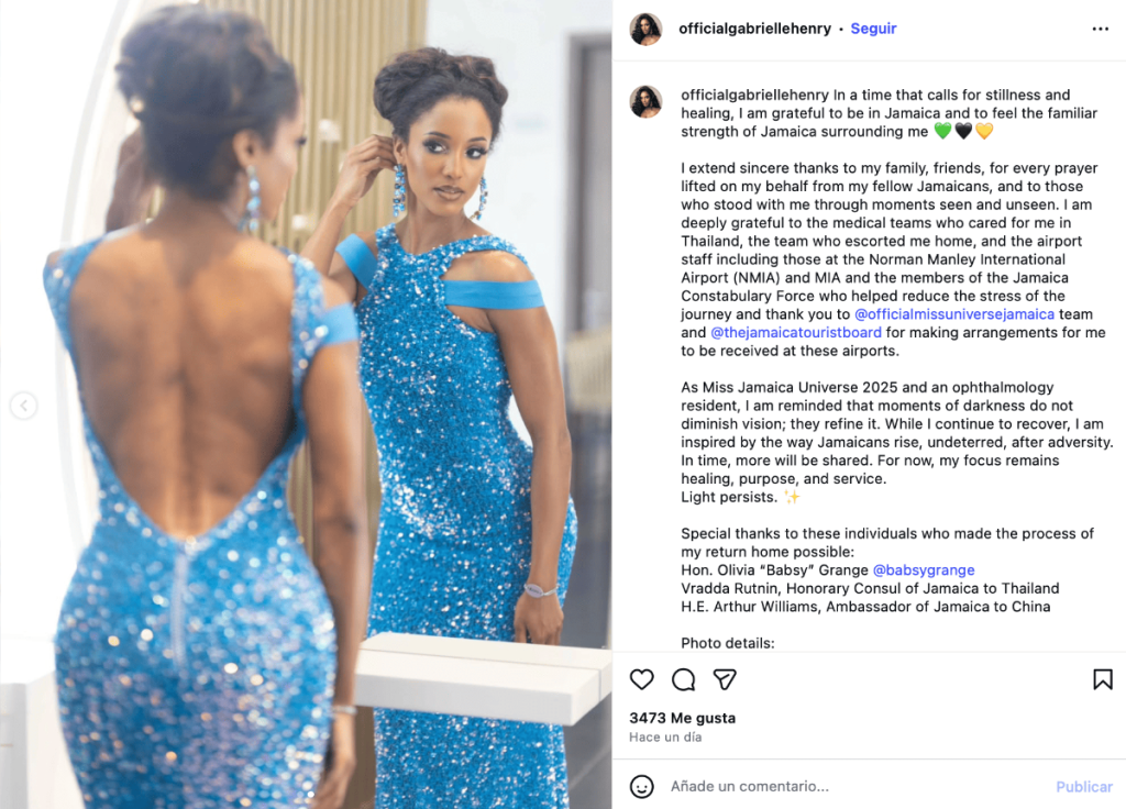 “Como Miss Jamaica Universo 2025 y residente de oftalmología, recuerdo que los momentos de oscuridad no disminuyen la visión; la refinan. Mientras sigo recuperándome, me inspira la forma en que los jamaicanos se levantan, sin desanimarse, tras la adversidad. Con el tiempo, compartiré más. Por ahora, mi enfoque sigue siendo la sanación, el propósito y el servicio. La luz persiste. Un agradecimiento”, se lee en el post.