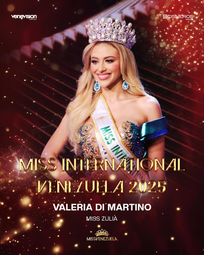 * Valeria DiMartino: Recibió la corona de Miss International Venezuela 2025. La representante originaria del estado Zulia se preparará para competir en Miss International, concurso donde Venezuela ostenta una rica historia de triunfos.