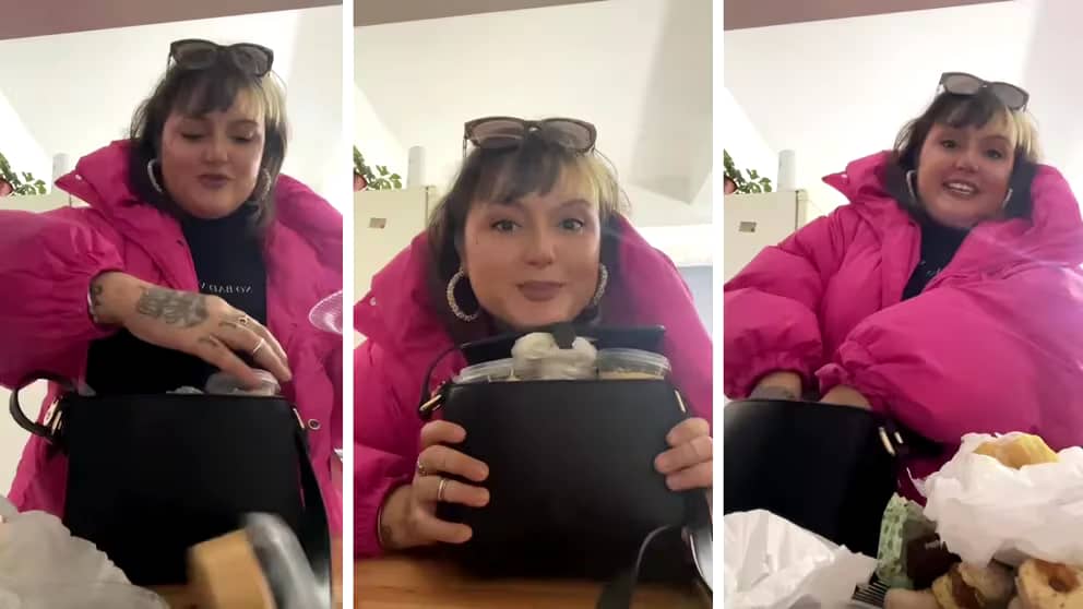 “Me traje comida para mi novio y me metí todo en la cartera”, reveló la chica en un video cuando llegó a su casa mientras mostraba con humor todo lo que había dentro de su bolso. Entre las delicias que llevó se encontraban masas secas, donas, potes con mousse de dulce de leche y galletitas, brownies, trufas y facturas. “Me dijeron que estaban ricos”, comentó la joven.