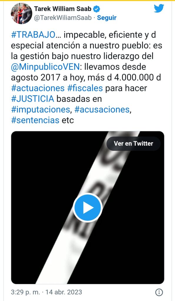 El fiscal General de la República Bolivariana de Venezuela, Tarek William Saab, ofreció el pasado viernes 14 de abril, un balance del trabajo del Ministerio Público durante su gestión, en la cual enfatizó que se han realizado más de 4 millones de actuaciones judiciales desde el año 2017.