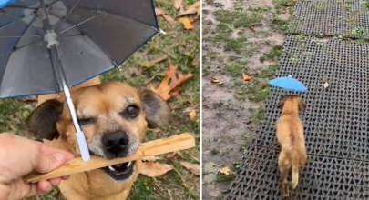 Minion, al igual que muchas personas, se rehúsa a dejar que el mal tiempo le impida disfrutar del aire libre. El video muestra cómo este ingenioso perrito sujeta un palo de madera, al cual está unido el mini paraguas, protegiendo su cabeza y continuando con su vida diaria a pesar de la precipitación.