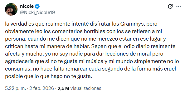 Finalmente, la intérprete hizo una reflexión sobre el impäcto emocional que genera el acøso constante en internet. Al confesar que las críticas hacia su persona y su derecho a estar en eventos de tal magnitud le han impedido disfrutar plenamente de sus logros, Nicki Nicole instó a la audiencia a practicar la empatía. «Si no te gusta mi música, simplemente no la consumas; no hace falta remarcar de la forma más cruel posible que lo que hago no te gusta», finalizó en su mensaje.