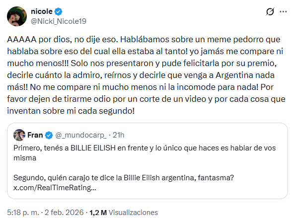 La argentina publicó un mensaje en sus redes sociales afirmando que se trató de una conversación amigable, ya que la nortermaericana también ha visto los memes en los que señalan a la argentina como la Billie Eilish latina, algo que los usuarios utilizaron para decir que fue Nicki Nicole quien se estaba comparando.