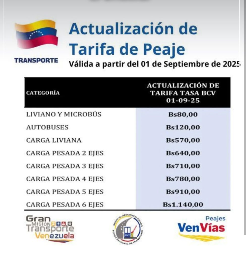 La escala de tarifas actualizada en los peajes de Venezuela es: