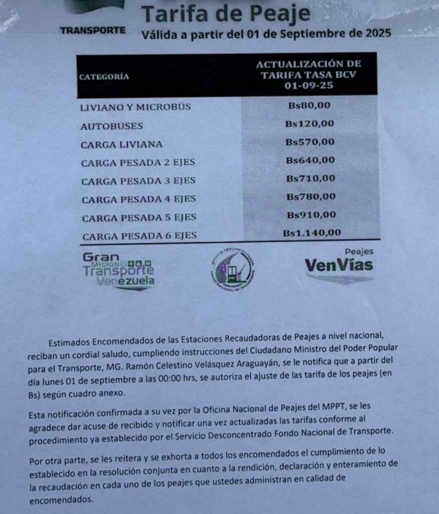 Se trata del tercer aumento en lo que va de 2025. El primero se registró en enero, cuando la tarifa para vehículos livianos pasó de 15 bolívares a 30 bolívares. El segundo ajuste se realizó en agosto cuando el monto mínimo pasó de 30 a 75 bolívares para carros particulares y autobuses.