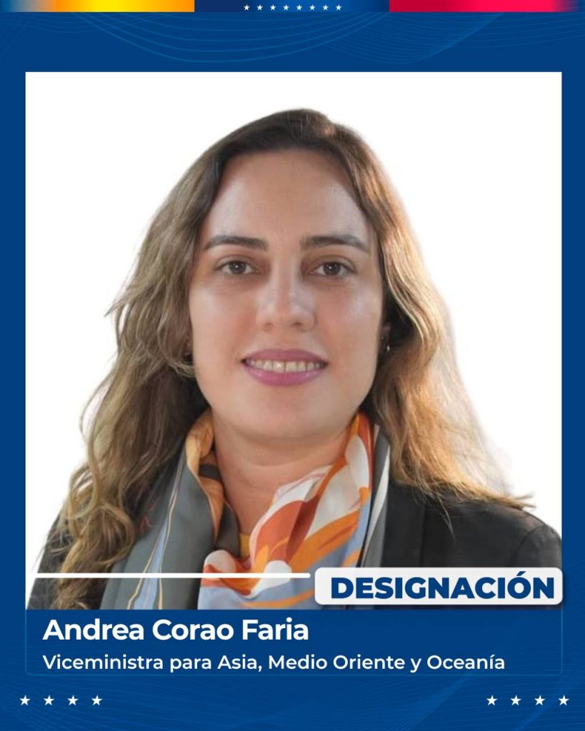 Mientras que en el Viceministerio para Asia, Medio Oriente y Oceanía fue nombrada Andrea Corao. «Su compromiso y capacidad fortalecerán nuestra diplomacia con países del mundo con quienes sostenemos relaciones estratégicas para seguir consolidando la defensa de la soberanía y la cooperación solidaria entre los pueblos hermanos», mencionó la Presidenta Encargada.