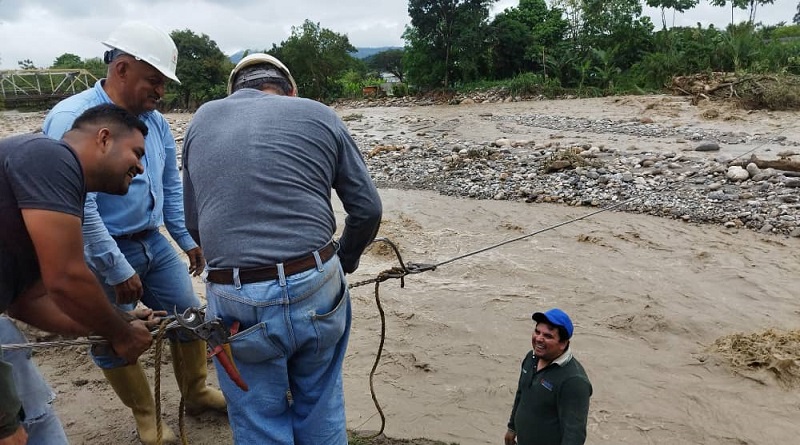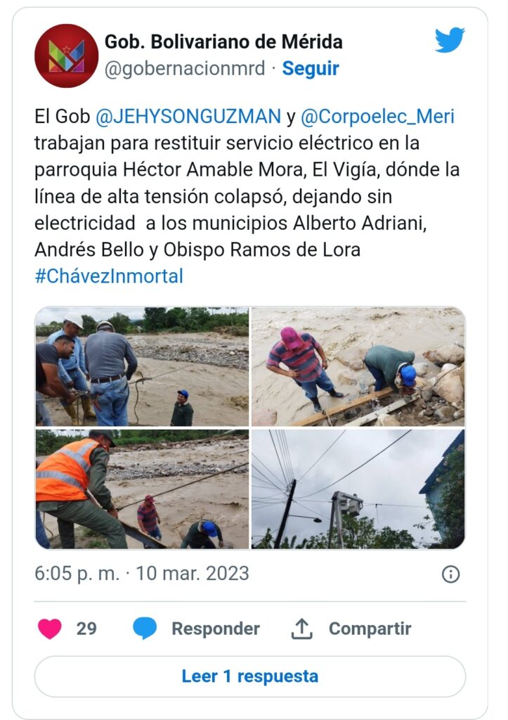 En el municipio alberto adriani del estado Mérida, las cuadrillas de la Gobernación y la Corporación Nacional Eléctrica (Corpoelec), restablecen la línea de tensión ubicada en la parroquia Héctor Amable Mora, la cual, colapsó como consecuencia de la crecida del río Mucujepe, causada por las fuertes precipitaciones que se registraron en la entidad.