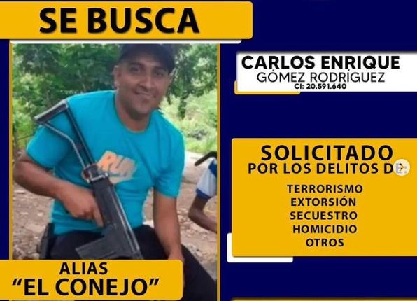 Carlos Enrique Gómez Rodríguez, apodado con el alías el «Conejo», es activamente buscado por las autoridades venezolanas, quienes ofrecieron una alta suma de dinero por información precisa que dé con su captura.