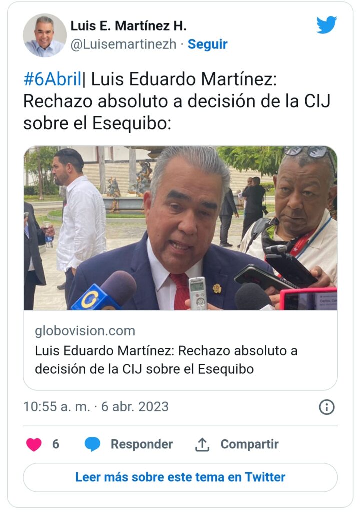 Entre las declaraciones destaca la del diputado Luis Eduardo Martínez, quien elevó su rechazo absoluto a la decisión de la CIJ, considerando que «los derechos de Venezuela sobre el territorio Esequibo son indiscutibles y de carácter histórico, legal y político provenientes del nacimiento mismo de la República por lo que todos los venezolanos debemos unirnos alrededor de la defensa a ultranza de esta tierra nuestra».