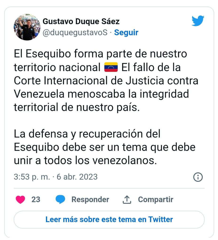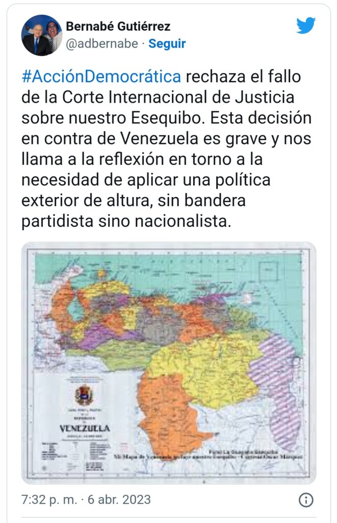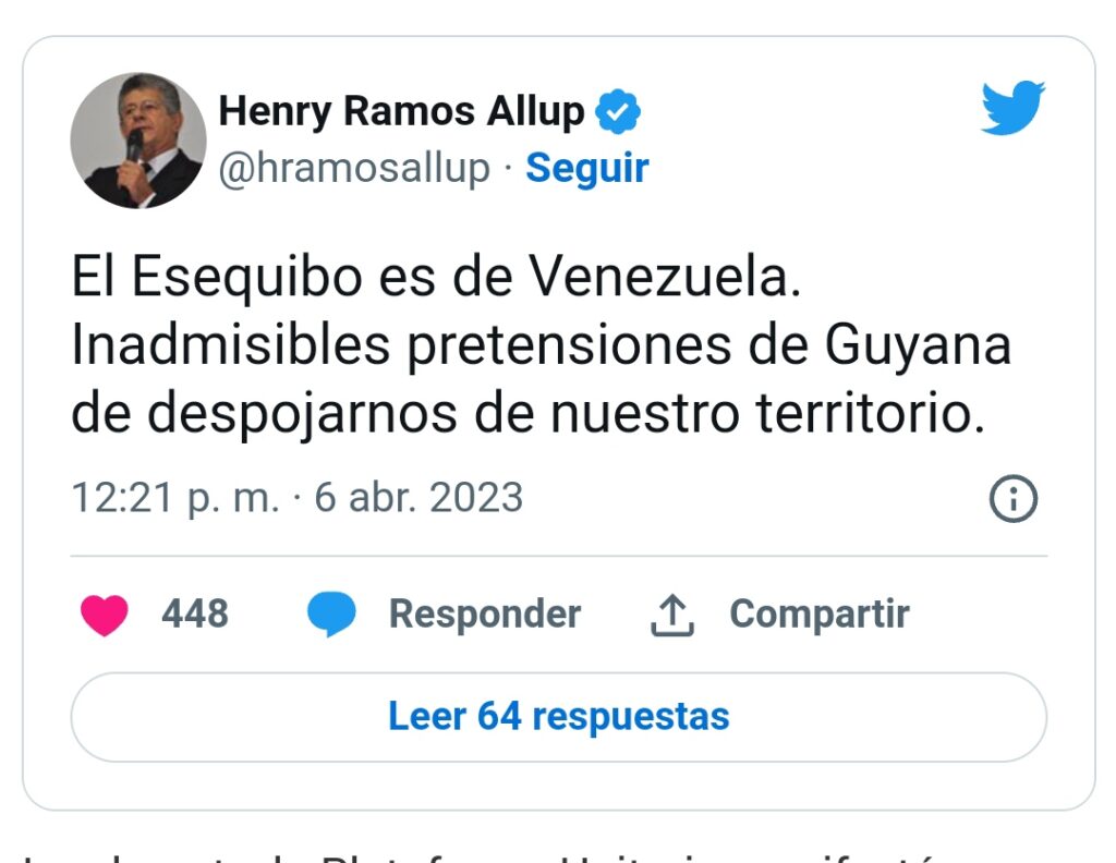 Por otro lado, Henry Ramos Allup apuntó que «el Esequibo es de Venezuela. Inadmisibles pretensiones de Guyana de despojarnos de nuestro territorio».