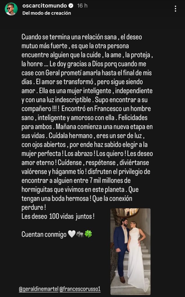 El cantante venezolano Oscarcito sorprendió este domingo al emitir un sentido mensaje público a su exesposa, Geraldine Martel, con motivo de su boda con Francesco Russo en Italia. El artista utilizó sus redes sociales para desear felicidad a la pareja y destacar la «relación sana» que mantiene con Martel.