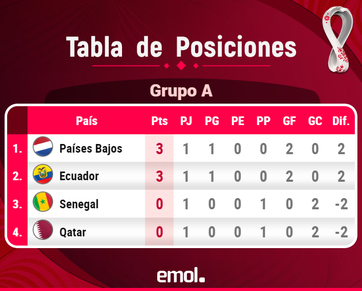 Países Bajos derrotó 2-0 a una dura Senegal para saltar al liderato de la zona. Con esto, los neerlandeses igualan a Ecuador, quien derrotó 2-0 a Qatar en el partido inaugural.