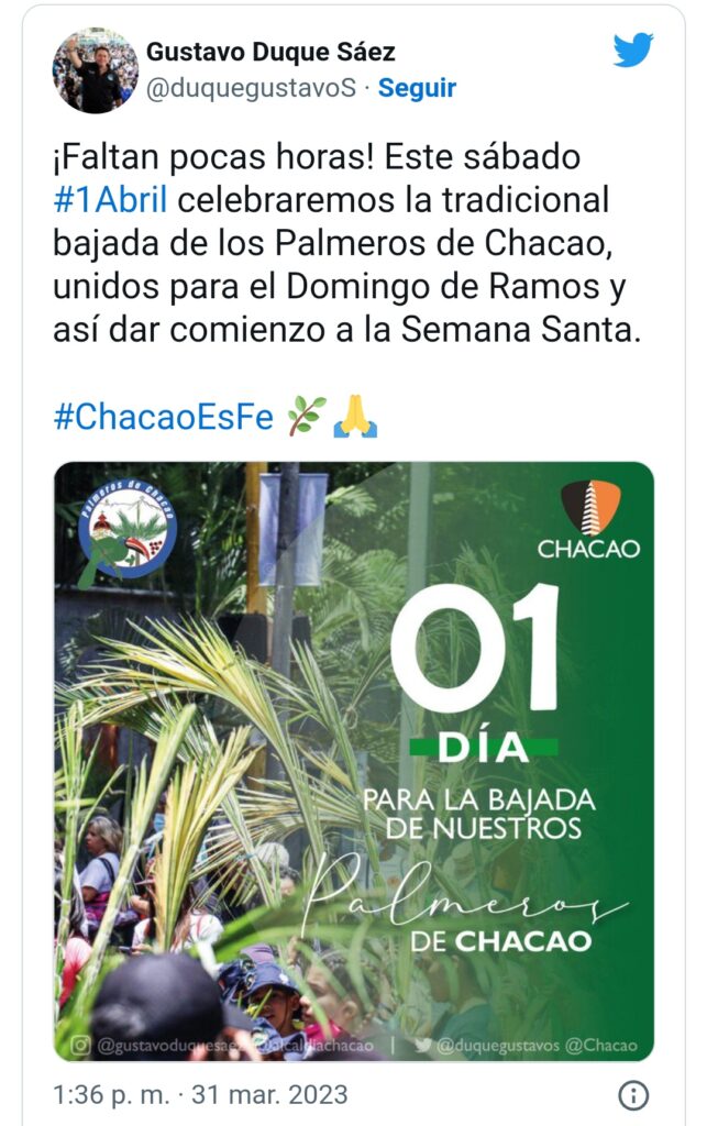 «¡Faltan pocas horas! El sábado #1Abril celebraremos la tradicional bajada de los Palmeros de Chacao, unidos para el Domingo de Ramos y así dar comienzo a la Semana Santa», destacó Duque a través de su cuenta en la red social Twitter.