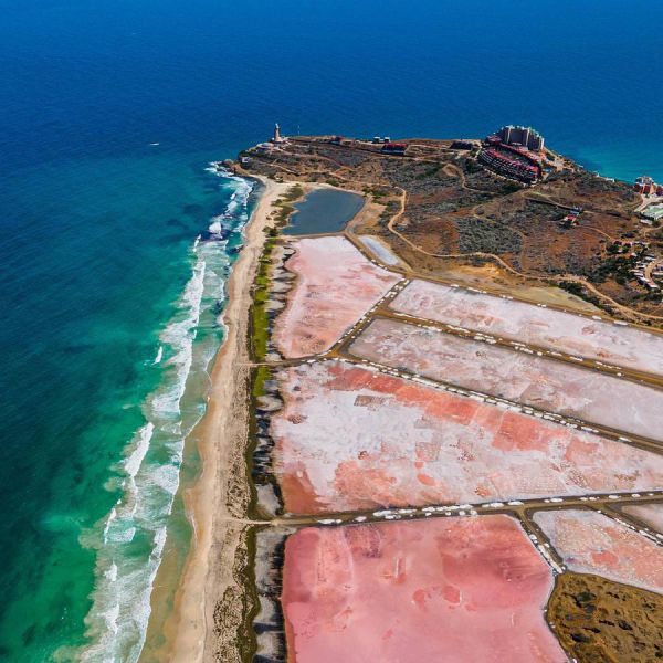 Desde la cima del Faro de Punta Ballena, los visitantes pueden disfrutar de una vista panorámica que permite apreciar la magnitud del paisaje de sal por un lado y el azul del Mar Caribe por el otro.
