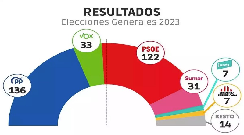 En tercer y cuarto lugar se encuentran Vox con 33 y Sumar con 31; asimismo los partidos, Esquerra Republicana de Catalunya (ERC) tiene 7, Junts per Catalunya (JuntsxCat) 7, EH Bildu 6, Partido Nacionalista Vasco (PNV) 5, Bloque Nacionalista Galego (BNG) 1, Unión del Pueblo Navarro (UPN) 1 y la Coalición Canaria (CC) 1.