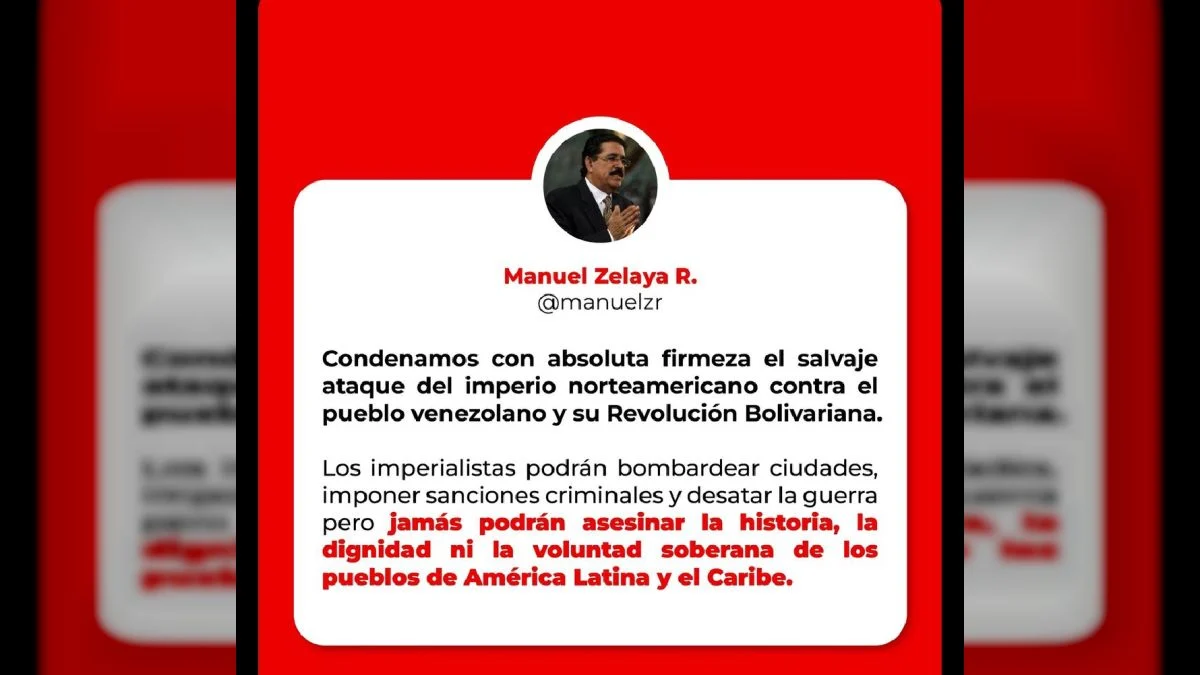 Por su parte, el Partido Libre de Honduras condënó con absoluta firmeza el salvaje atâque del imperio norteamericano contra el pueblo venezolano y su Revolución Bolivariana. «Los imperïalistas podrán bombârdear ciudades, imponer sancïones crïmïnâles y desatar la güerra, pero jamás podrán asêsinâr la historia, la dignidad, ni la voluntad soberana de los pueblos de América Latina y el Caribe», expresó Manuel Zelaya, miembro del Partido Libre a través de X.