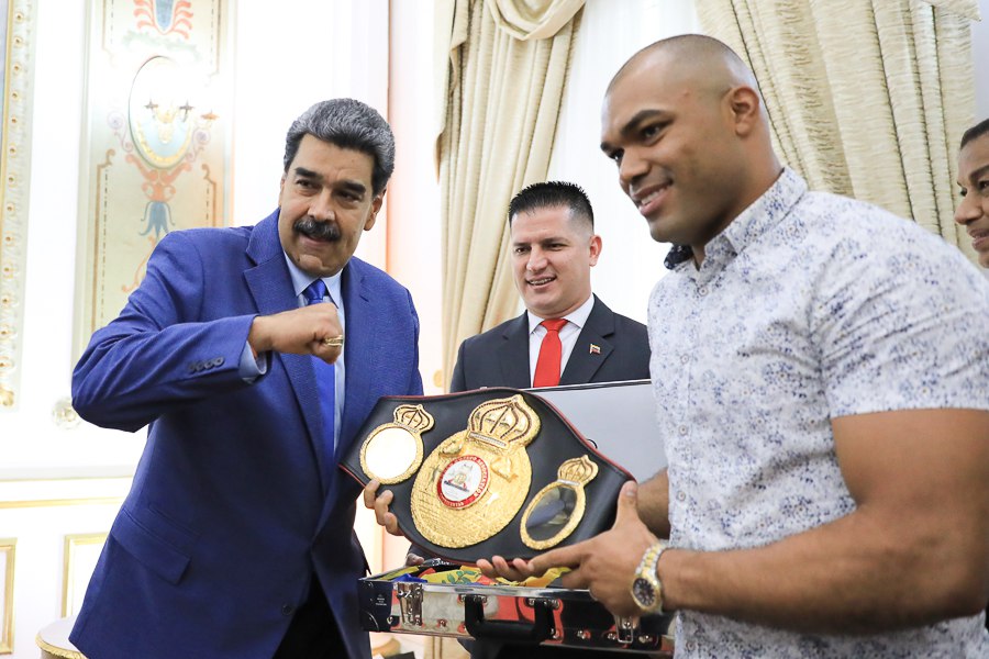El jefe de Estado acompañado del ministro del Poder Popular para la Juventud y Deporte, Mervin Maldonado, recibió por parte de Kremlev, el cinturón honorífico que lo acredita como campeón mundial del boxeo, como un obsequio en la lucha por la defensa de la nación.