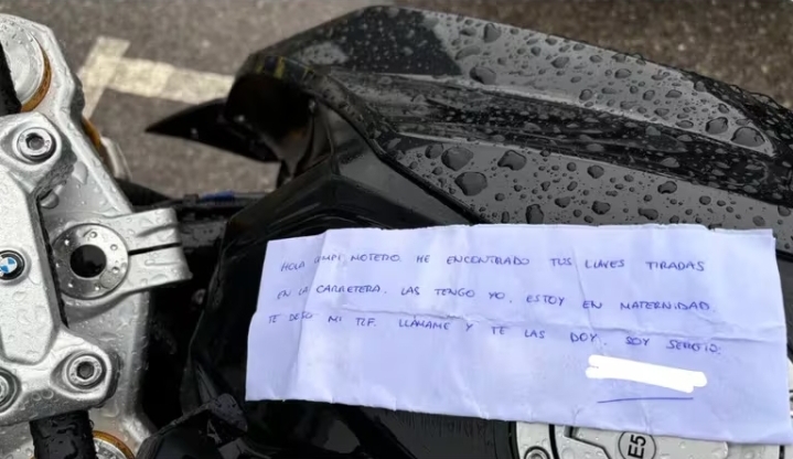 La sorpresa llegó cuando fue a verificar si su vehículo seguía en su lugar o si alguien se la había llevado. Sobre el asiento, encontró una nota escrita por Sergio, un paciente del hospital, que decía: “Hola compi motero, he encontrado tus llaves tiradas en la carretera. Las tengo yo, estoy en maternidad. Te dejo mi teléfono, llámame y te las doy. Soy Sergio”.