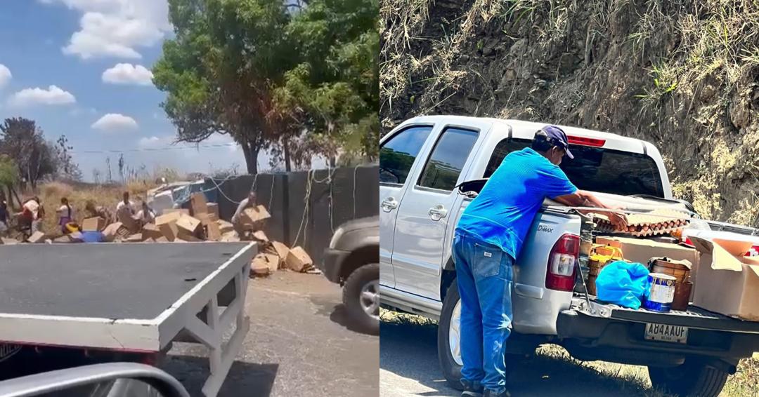 Durante el hecho, personas se acercaron al camión para robarse las cajas de huevos tras el accidente, olvidándose del chofer quien se encontraba herido.