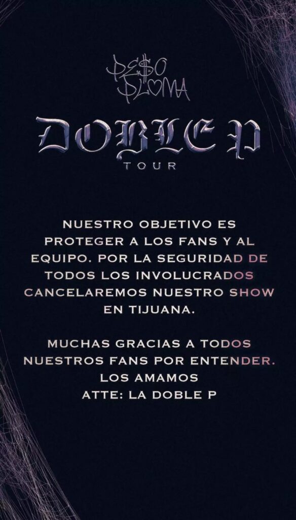 “Nuestro objetivo es proteger a los fans y al equipo. Por la seguridad de todos los involucrados cancelaremos nuestros shows en Tijuana. Muchas gracias a todos nuestros fans por entender. Atentamente: La Doble P”, escribió el cantante en el mensaje.