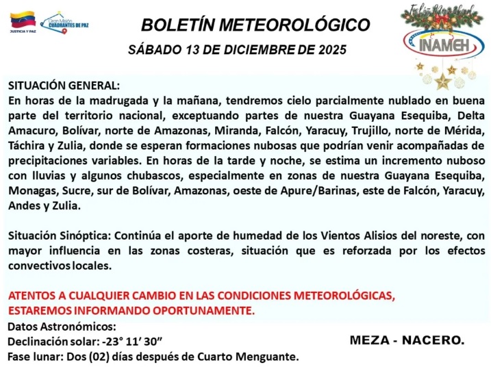 De igual forma, el Inameh indica que en horas de la tarde y noche, se estima un incremento nuboso con lluvias y algunos chubascos, especialmente en zonas de la Guayana Esequiba, Monagas, Sucre, sur de Bolívar, Amazonas, oeste de Apure/Barinas, este de Falcón, Yaracuy, Andes y Zulia.