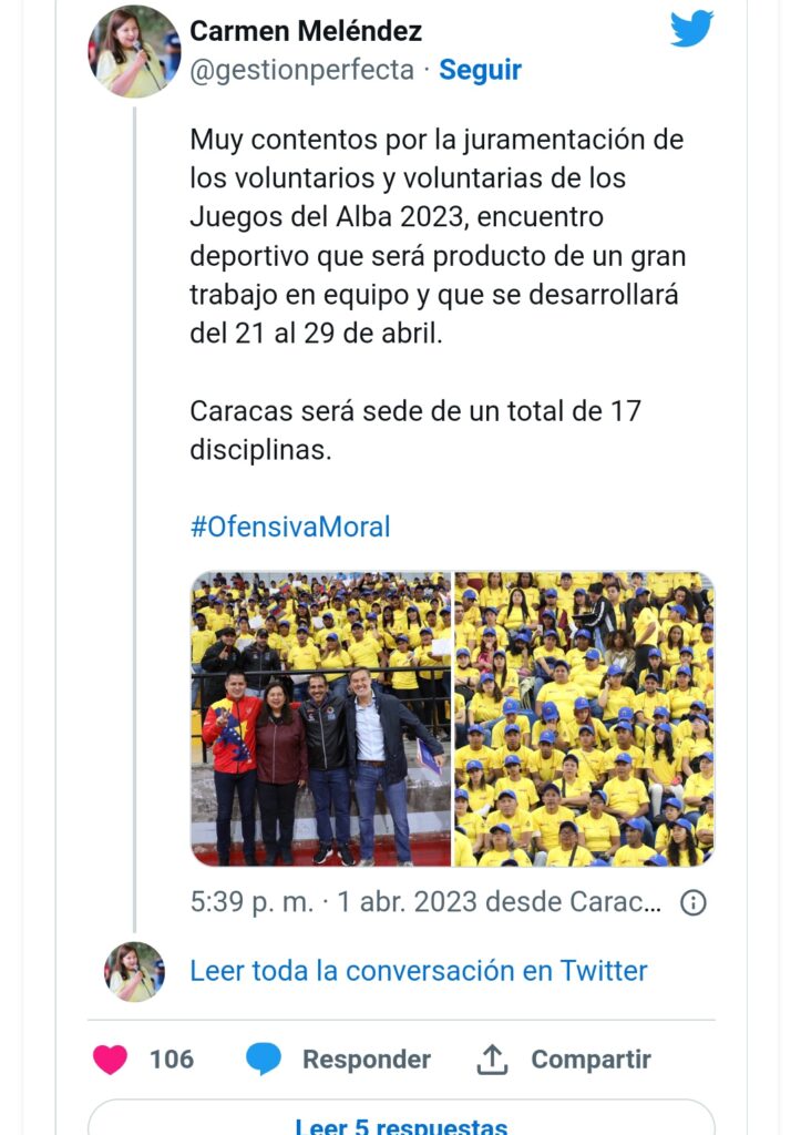 La presentación la realizó la alcaldesa de Caracas, A/J Carmen Meléndez, junto al Vicepresidente sectorial del Socialismo Social y Territorial, ministro del Poder Popular para la Juventud y Deporte, Mervin Maldonado, durante la ceremonia de juramentación de voluntarios y voluntarias que contribuirán en el buen y exitoso desarrollo del encuentro deportivo que se efectuará en Venezuela del 21 al 29 de abril.
