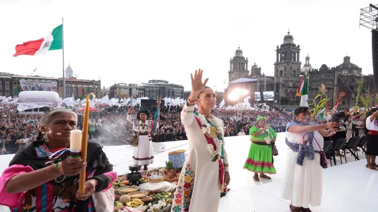 La presidenta de México, Claudia Sheinbaum, recibió este 1 de octubre el «bastón de mando» de los pueblos indígenas en su primer acto público, donde leyó sus 100 compromisos de Gobierno ante miles de seguidores en la plaza principal capitalina del Zócalo, frente al Palacio Nacional, sede del Ejecutivo federal.