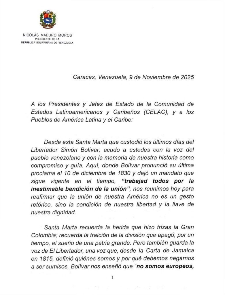 Este domingo, 09 de noviembre, el presidente de la República, Nicolás Maduro, envió una carta a sus homólogos de la Comunidad de Estados Latinoamericanos y Caribeños (CELAC) para advertirles sobre las amênâzas de Estados Unidos en el Caribe.