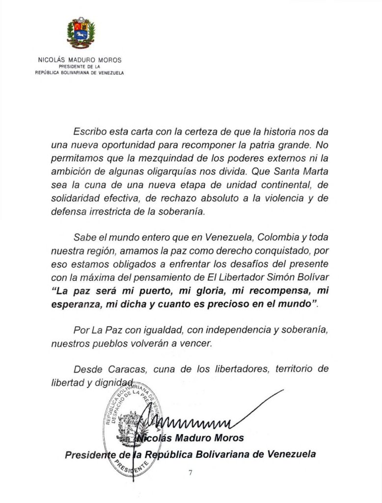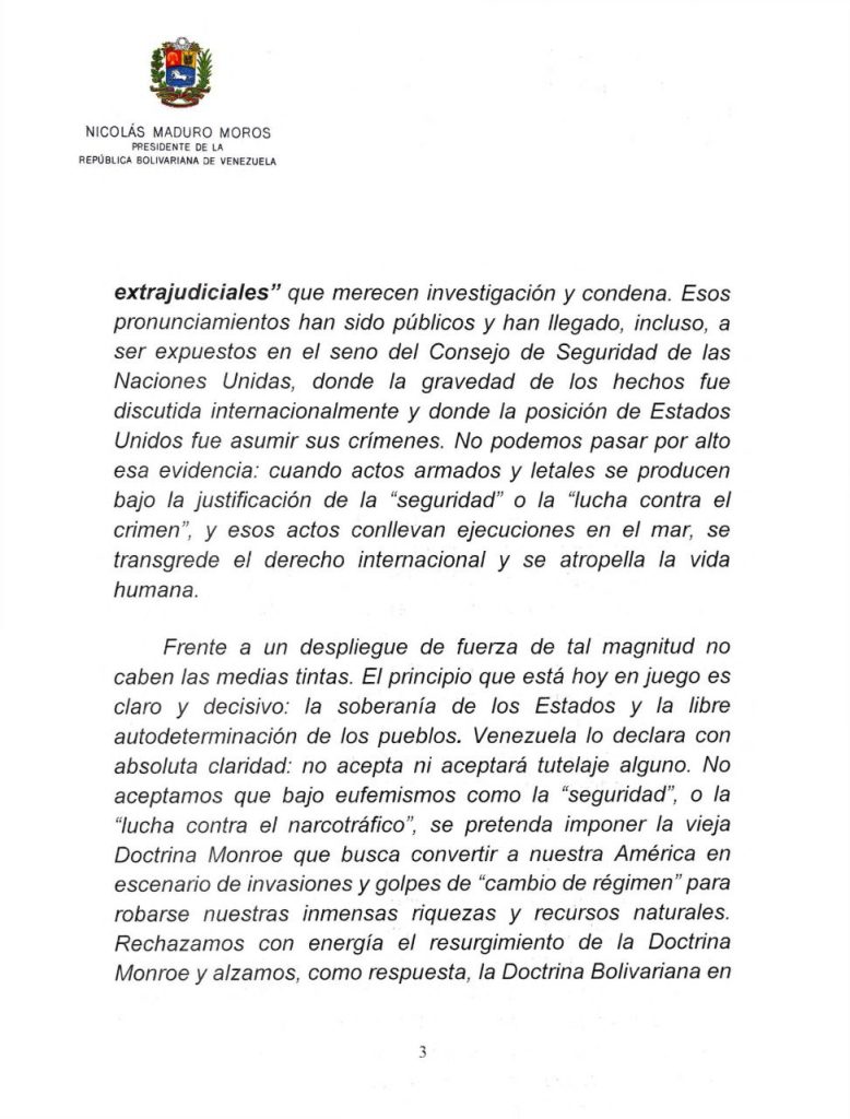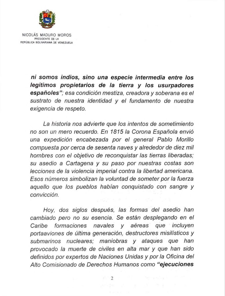 La misiva compartida por el canciller de la República, Yván Gil, a través de su canal de Telegram, resalta que «frente a estas amênâzas y las ejecuciønes que han sido dênuncïâdas por la ONU (Organización de las Naciones Unidas); estamos obligados, para preservar la paz de la región, a sumar nuestras füerzas como países, y en una sola voz exigir el cese inmediato de los atâques y amênâzas militares contra nuestros pueblos».