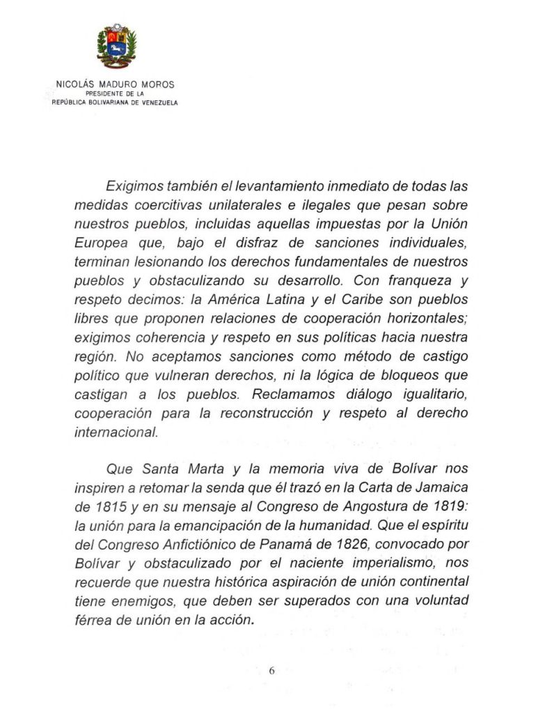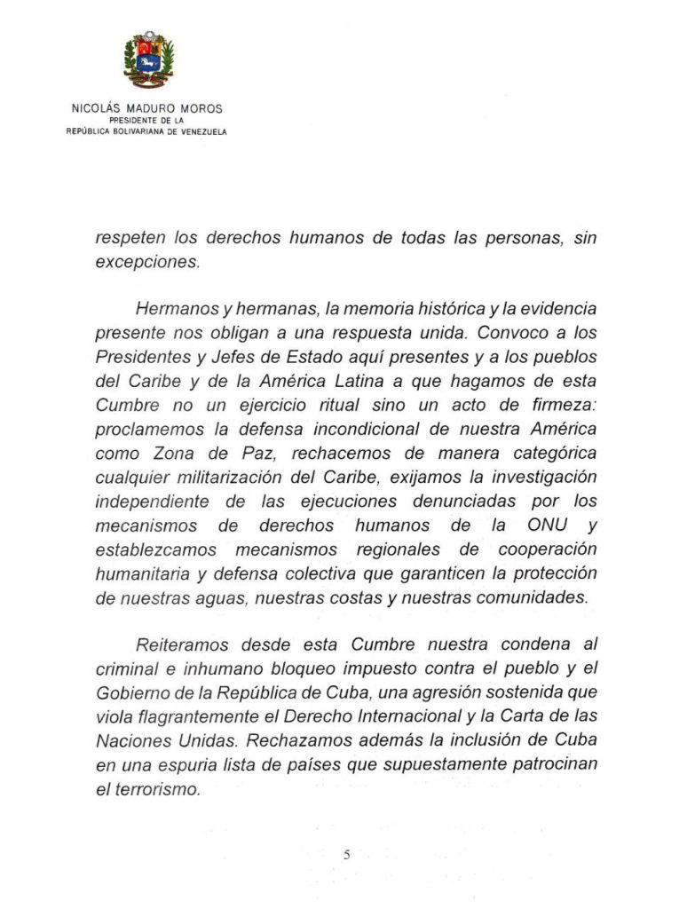 Por tal razón, en el texto, el Jefe de Estado instó a sus homólogos a reafirmar el Caribe como una Zona de Paz y rechäzar de manera categórica cualquier militarización de este espacio marítimo. Además, indicó que se debe exigir la investigación independiente de las ejecuciønes dênuncïâdas por los mecanismos de derechos humanos de la ONU. Aunado a ello, señaló que desde este espacio se debe reiterar también la condêna al crïminâl e inhumano blöqueo impuesto contra el Pueblo y el Gobierno de la República de Cuba.