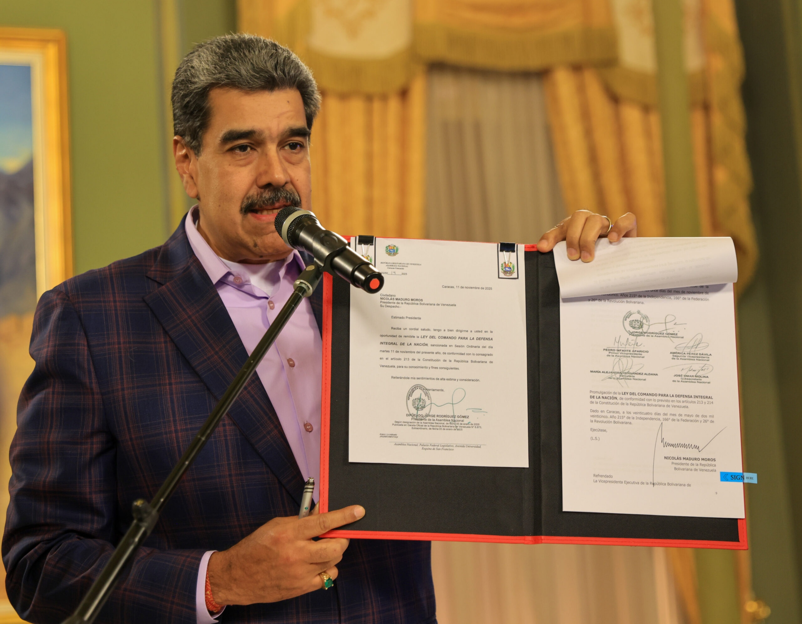 Desde el simbólico e importante salón Sol del Perú, del Palacio de Miraflores, el Jefe de Estado recibió a la delegación parlamentaria con una ley que recoge la doctrina histórica de Venezuela, la Doctrina Militar de Defensa Integral de la Nación, la Doctrina Bolivariana y Zamorana, la cual «institucionaliza poderosamente la corresponsabilidad para la Defensa de la Nación», dijo Maduro.