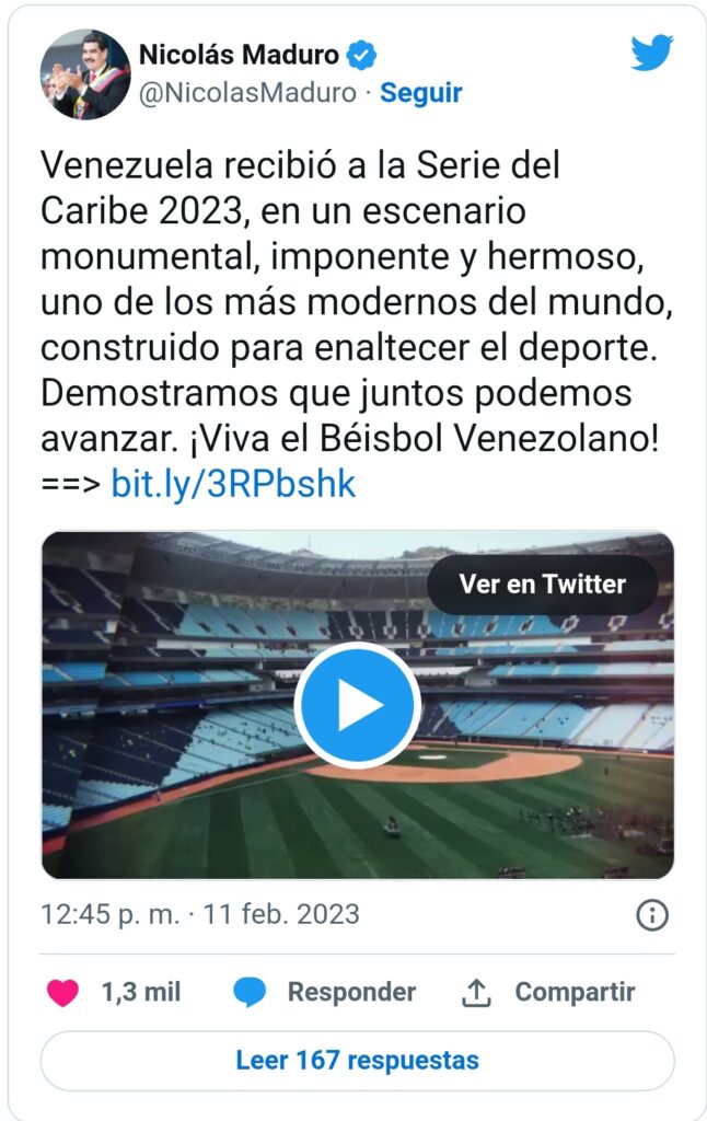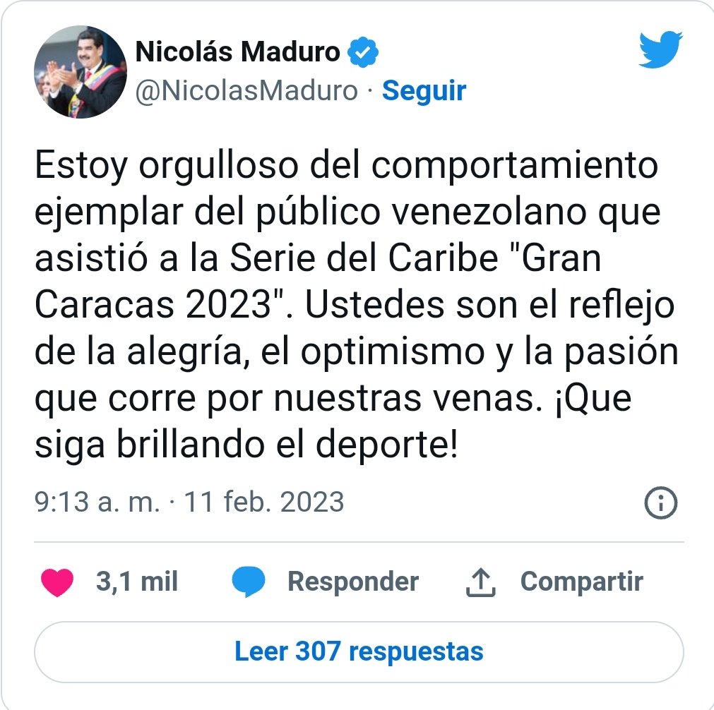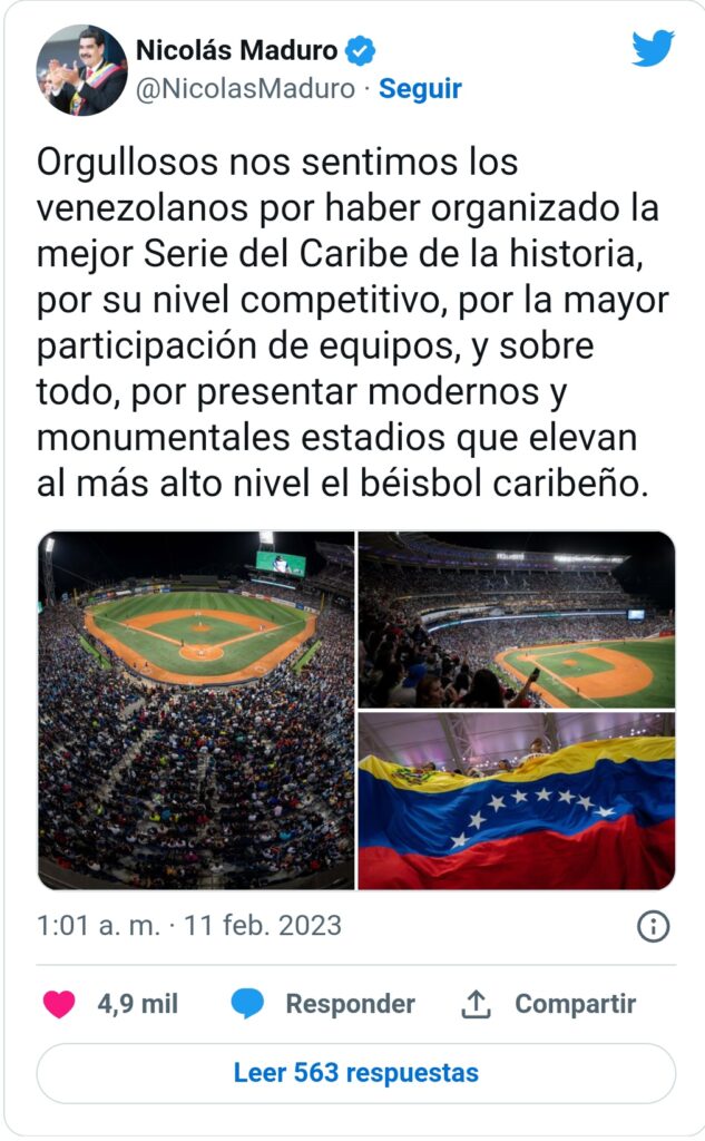 «Orgullosos nos sentimos los venezolanos por haber organizado la mejor Serie del Caribe de la historia, por su nivel competitivo, por la mayor participación de equipos y, sobre todo, por presentar modernos y monumentales estadios que elevan al más alto nivel el béisbol caribeño», dijo el mandatario en un mensaje publicado en su cuenta en Twitter.
