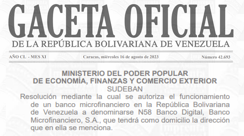 Se trata del «N58 Banco Digital», el primer banco que operará 100% de forma digital en Venezuela, según la Superintendencia de Instituciones del Sector Bancario (Sudeban), que autorizó su funcionamiento, publicada en Gaceta Oficial N° 42.693 con fecha del 16 de agosto, como resolución de la Sudeban bajo el número 033.23.
