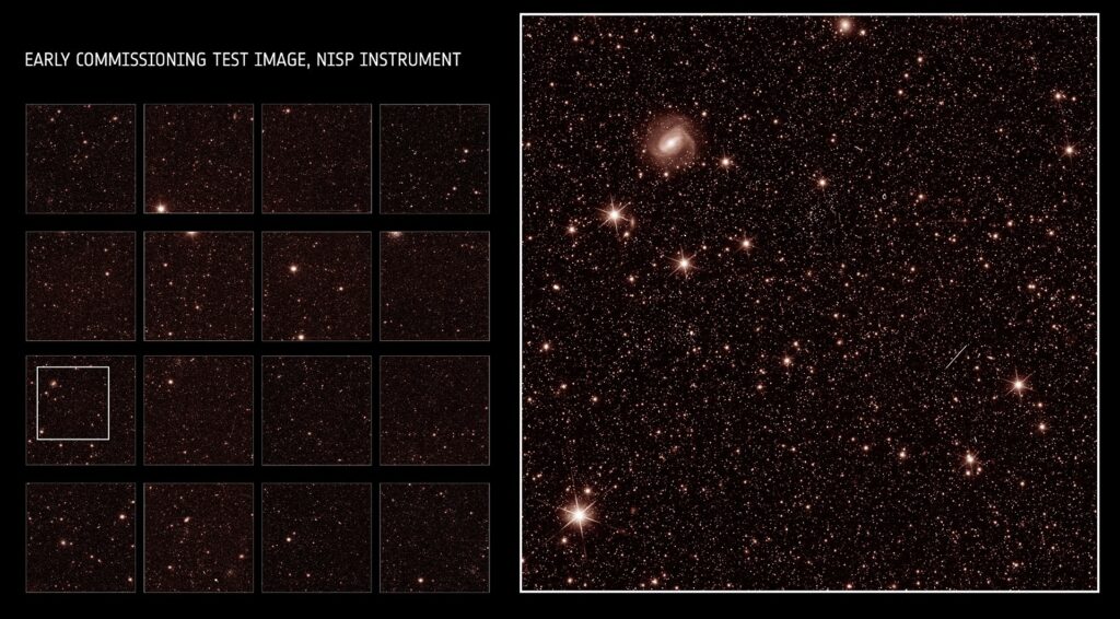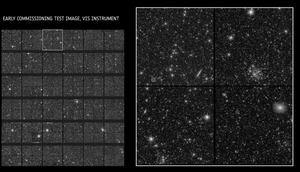Las dos imágenes obtenidas se corresponden con las dos formas de captar la luz que aportan estos dos instrumentos que porta el telescopio junto a su lente de 1,2 metros de diámetro. Por un lado, el instrumento VISible de Euclid (VIS) tomará imágenes supernítidas de miles de millones de galaxias para medir sus formas. Por otro, la cámara que capta el infrarrojo cercano (NISP) tiene una doble función: obtener imágenes de las galaxias en luz infrarroja y medir la cantidad de luz que emiten las galaxias en varias longitudes de onda, lo que permite calcular directamente cómo de lejos está cada galaxia.