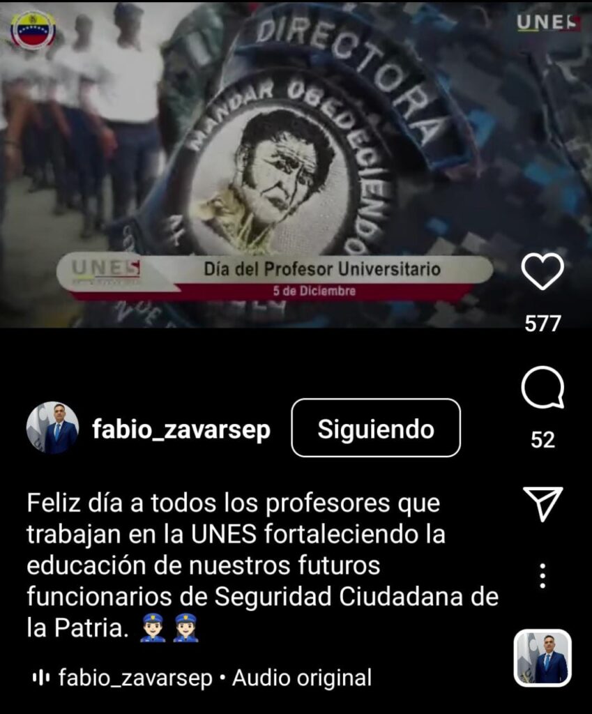El rector de la Universidad Nacional Experimental de la Seguridad (UNES), Fabio Zavarse, a través de su cuenta en Instagram publicó un emotivo mensaje en celebración de los profesores universitarios en su día.