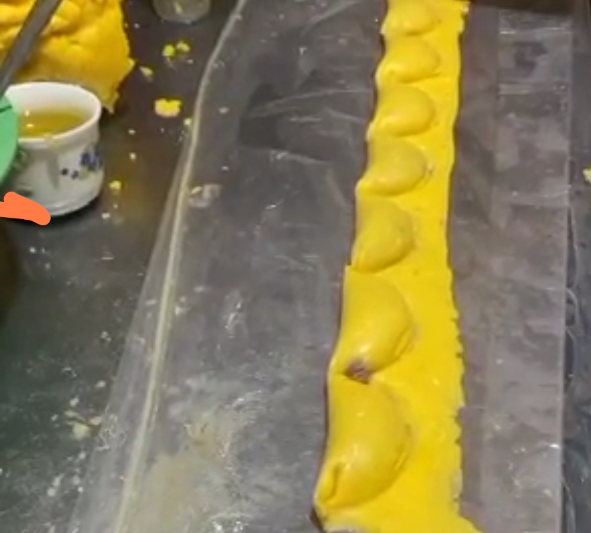 En el audiovisual se puede apreciar a la chica estirando la masa para hacer empanadas con una botella de vidrio y a su vez, colocando el relleno proteico (carne), con una rapidez impresionante.