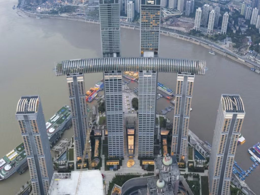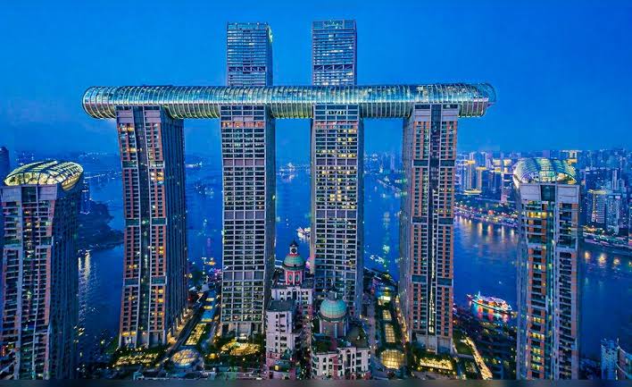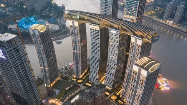 Para sorpresa de nadie, la ingeniería en China ha vuelto a romper un récord mundial con la construcción de un rascacielos horizontal que se extiende por 300 metros sobre el cielo de la ciudad Chongqing. Esta estructura cilíndrica está sobre cuatro rascacielos ‘normales’ de 250 metros de altura, por lo que actúa como un puente masivo entre los edificios del complejo Raffles City.