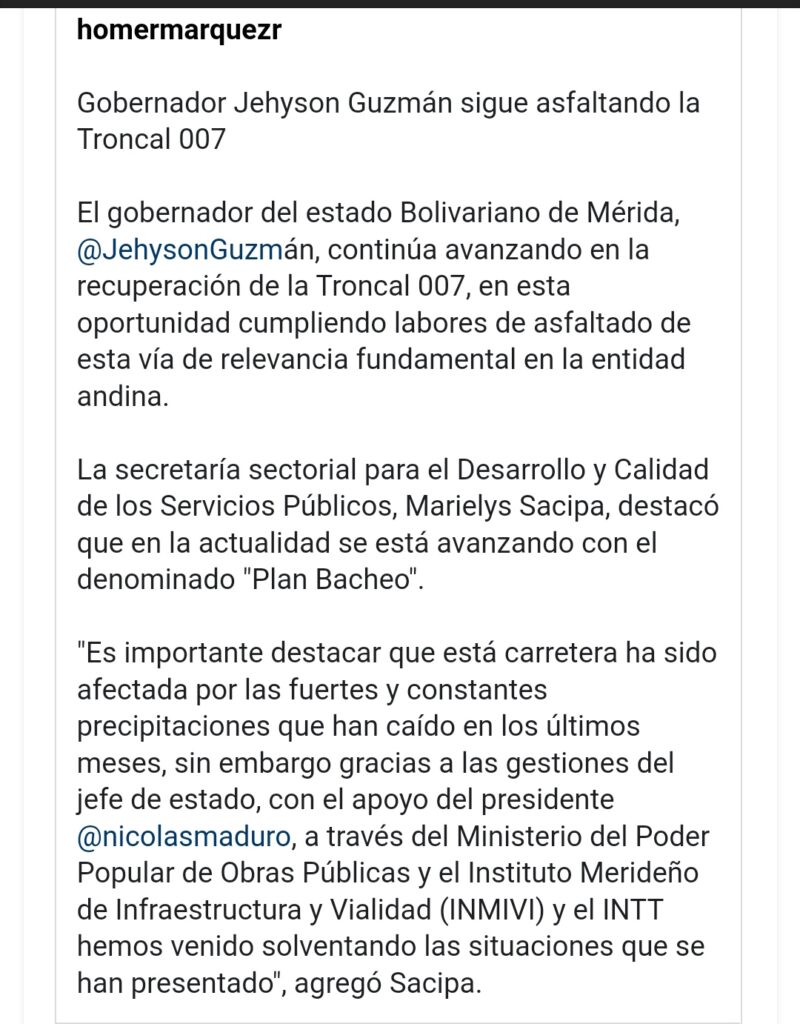 Tras las gestiones del gobernador, con el apoyo del presidente de la República Bolivariana de Venezuela Nicolás Maduro, a través del Ministerio del Poder Popular de Obras Públicas y el Instituto Merideño de Infraestructura y Vialidad (Inmivi) y el INTT, señaló: “hemos venido solventando las situaciones que se han presentado en estas temporadas de abundantes precipitaciones”, agregó Sacipa.