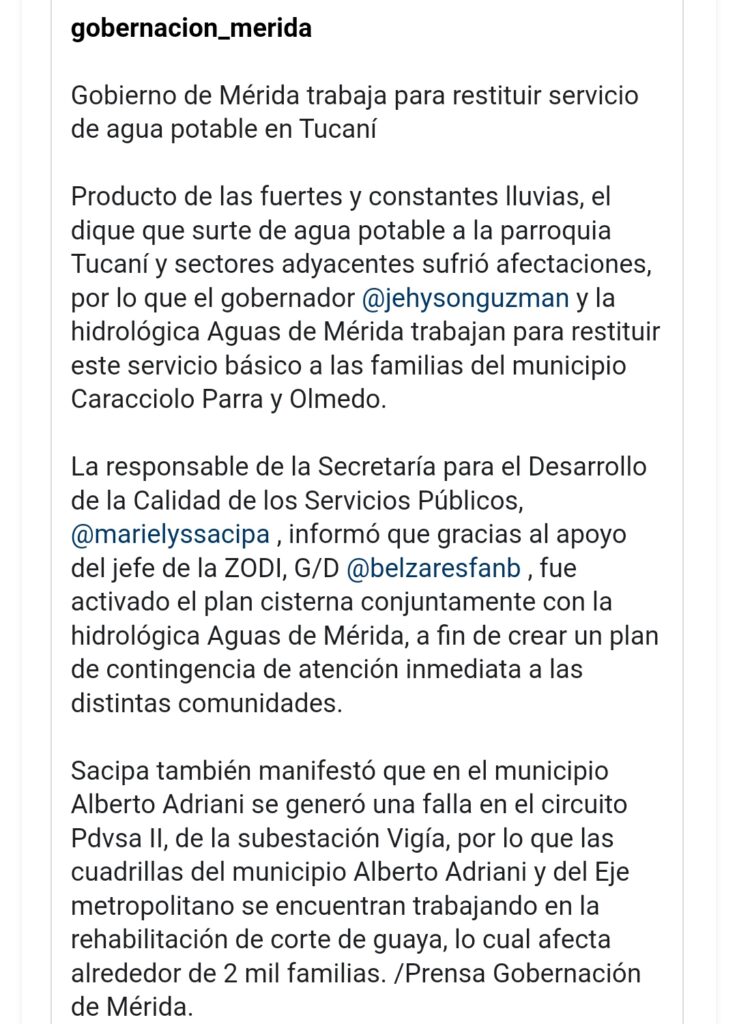 La responsable de la secretaría para el Desarrollo de la Calidad de los Servicios Públicos, Marielys Sacipa, informó que, “gracias al apoyo del jefe de la ZODI, G/D Rubén Belzares, fue activado el Plan Cisterna conjuntamente con la hidrológica Aguas de Mérida, a fin de crear un plan de contingencia de atención inmediata a las distintas comunidades, mientras restauran el servicio de agua por acueducto”.