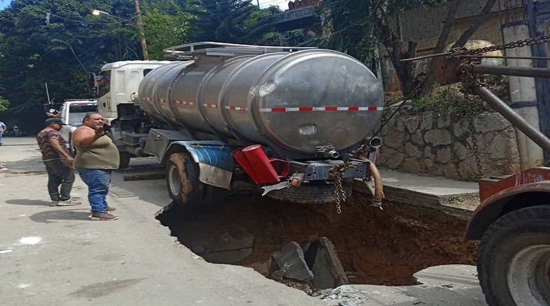 El equipo del Gobierno de Distrito Capital (GDC) rescató un camión cisterna que se encontraba accidentado producto de un hundimiento en la calle Zulia, de la parroquia La Vega.
