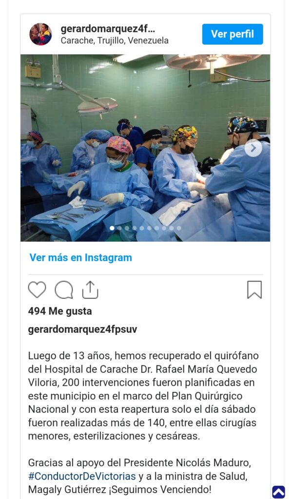Así lo informó el gobernador de la región, Gerardo Márquez, a través de su cuenta en la red social Instagram, en la que destacó que esta acción se llevó a cabo en el Hospital «Rafael Quevedo Viloria», ubicado en el municipio Carache, luego de reactivar los quirófanos que se mantuvieron inactivos por más de 13 años.