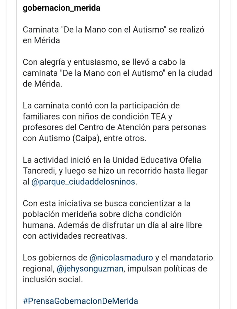 La información fue publicada en la red social Instagram de la Gobernación de Mérida @gobernacion_merida, donde reseñaron que la actividad inició en la Unidad Educativa Ofelia Tancredi, y luego se hizo un recorrido hasta llegar al Parque Ciudad de los Niños.