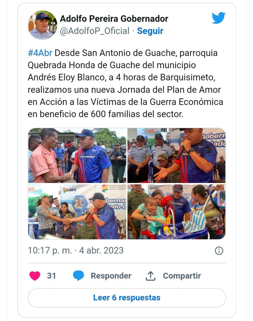 La información la suministró el gobernador de la entidad, Adolfo Pereira, en su cuenta en la red social Twitter, @AdolfoP_Oficial.